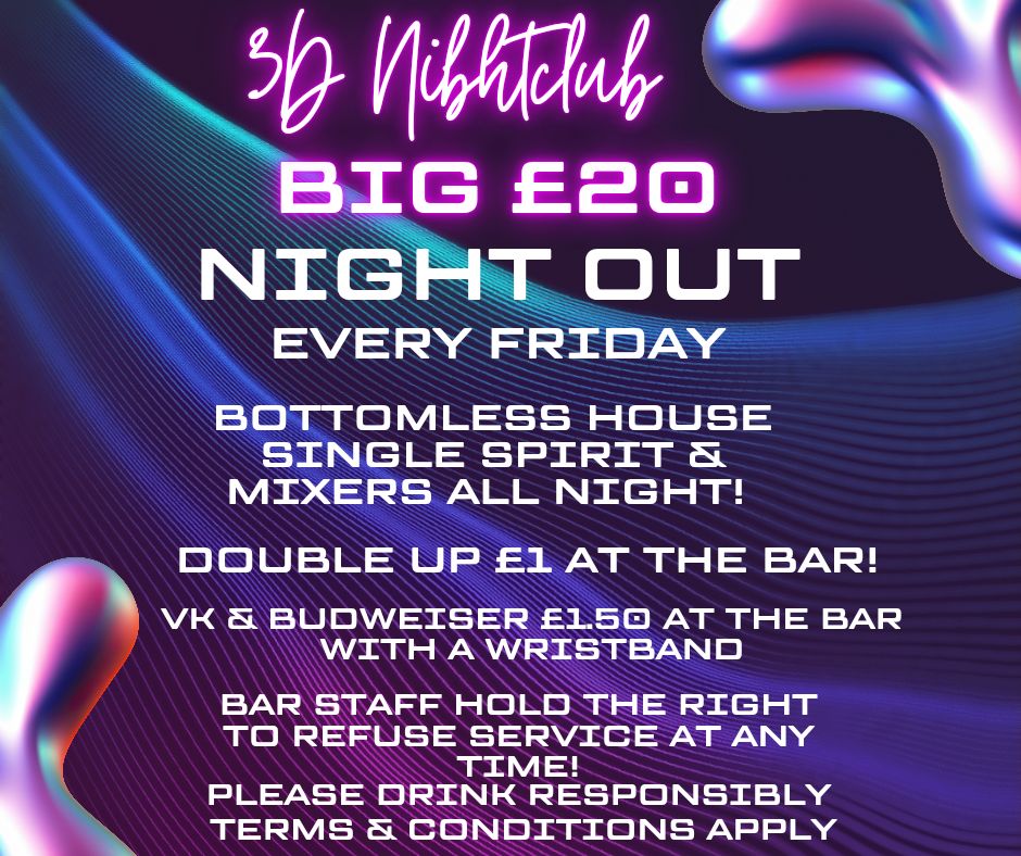Every Friday join us at 3D Congleton for the best Value for Money night out any town could want! £20 for Unlimited Single House Spirit Mixers ALL NIGHT! Double up for £1. Selected Bottles just £1.50 each with a wristband!