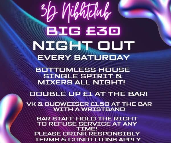 Every Saturday join us at 3D Congleton for the best Value for Money night out any town could want! £30 for Unlimited Single House Spirit Mixers ALL NIGHT! Double up for £1. Selected Bottles just £1.50 each with a wristband!